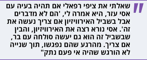 "דיברתי עם ציפי רפאלי ושאלתי אם תהיה בעיה עם אסי, היא אמרה לי, 'לא תהיה שום בעיה. מבחינתנו אין שום בעיה עם אסי. הם לא מדברים אבל בשביל האירוויזיון אם צריך נעשה את זה'. לא הייתה שום התניה מאף אחד מהצדדים. אסי נורא רצה את האירוויזיון, והוא הבין שבשביל האירוויזיון הוא גם יעשה סולחה עם בר, אם צריך".