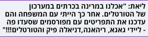 ליאת: "אתן לא מאמינות. נכון אכלנו במרינה הזאת בכרתים במערכון של הטורטלים, במסעדת דגים? הייתי שם שוב. זוכרות, סיימנו ומתנו לישון והיה כזה דייג, ג'ובאני, שהעמיס מלא דגים שדגו היום, שעתיים עלי גפן ואנחנו רק רוצות לישון ויש פתאום עיקריות! בקיצור, הייתי עם המשפחה ואני אומרת להם, 'פה אכלנו'. התיישבנו, והם עידכנו את התפריטים. יש תפריטים של מפורסמים שסעדו פה, ליידי גאגא, ריהאנה, דניאלה פיק והטורטלים!!!"