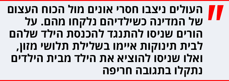 "חטיפת הילדים נעשתה בשיתוף ובתיאום בין כל זרועות השלטון, החל מהנהגת המדינה ומהנהלת הסוכנות היהודית, דרך מערכת הרפואה הממלכתית וארגוני הנשים, מערך רישום האוכלוסין ורשויות האכיפה, וכלה במתן 'הכשר' למעשים מבתי המשפט. העולים ניצבו חסרי אונים מול הכוח העצום של המדינה כשילדיהם נלקחו מהם, ללא יכולת להתנגד. על הורים שניסו להתנגד להכנסת הילד שלהם לבית תינוקות איימו בשלילת תלושי מזון, ואלו שניסו להוציא את הילד מבית הילדים נתקלו בתגובה חריפה, בשיגור שומרים שסילקו אותם והתייחסו אליהם כאל פושעים, ובהחזרת הילד למוסד לעתים תוך שימוש באלימות נגד ההורים ה'סוררים'. השלב הבא, לרוב תוך ימים ספורים, היה בשורת פטירה של הילד".