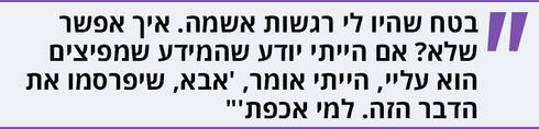 "בטח שהיו לי רגשות אשמה. איך אפשר שלא? אם הייתי יודע שזה המידע, הייתי אומר, 'אבא, שיפרסמו את הדבר הזה. למי אכפת. אני מאחורי זה כבר כמה שנים'. לכי תדעי מה היה קורה. חוסר הידיעה הזה הטריף אותי. אם אולי יש לי אחריות לסיפור הזה - מכל האשמים שאתה מפיל עליהם אחריות, אתה מפיל אחריות גם על עצמך, מה היית יכול לעשות אחרת. לא ידעתי אז שהיה לי כוח בידיים, אם באמת המידע הזה היה עליי. לא ידעתי שהייתי קלף במשחק. אם הייתי יודע שזה המידע אז הייתי אומר שיספרו את זה לכל העולם ואשתו. לא אכפת לי'".