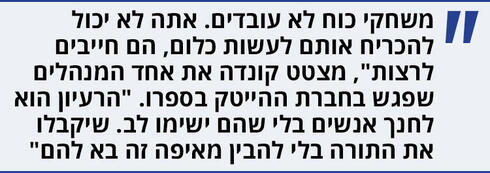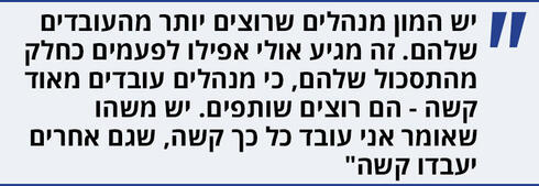 "אבל בפרספקטיבה אני חייבת להגיד שרוב האנשים לא הולכים לשם", מדגישה בליץ, "יש המון מנהלים שרוצים יותר מהעובדים שלהם. זה מגיע אולי אפילו לפעמים כחלק מהתסכול שלהם, כי מנהלים עובדים מאוד קשה - הם רוצים שותפים לזה. יש משהו שאומר: אני עובד כל כך קשה, שגם אחרים יעבדו קשה, קול של: 'מה הפינוק הזה? זה מה שהארגון דורש'".