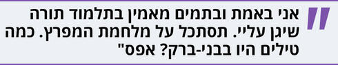 "בבקשה. אני מאמין לחלוטין בקיום קהילת לומדי תורה. ומאמין גם בקיום צה"ל. תלמיד ישיבה שלא לומד, חייב להתגייס. אבל מי שכן? אני באמת ובתמים מאמין בתלמוד תורה שיגן עליי. על אמת! תסתכל על מלחמת המפרץ. כמה טילים היו בבני-ברק? אפס".