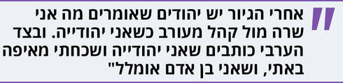 "איפה שאני יכולה לעזור ושהקול שלי ישפיע - אני שם. חוק הלאום, כל דבר שיש. איפה שצריך לצעוק. אמא שלי מדברת בערבית, אבא שלי מדבר בערבית, השכנים שלי מדברים בערבית, החברים שלי, הקהל שלי, כל מי שמסביבי, אז איך אפשר לבטל את הדבר הזה? מנסים להדחיק את אמא שלי, לסתום לה את הפה. ואי-אפשר. זה דבר שמאוד פגע בי. אני לא מוותרת על זה. וזה לא סותר את העובדה שהתגיירתי - אני עדיין חושבת שצריך להילחם כדי שלא יבטלו כאן בני אדם. אי-אפשר לבוא ולבטל אותי, את השפה שלי, את מי שאני".