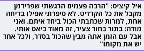 אחרי כמעט 15 שנה של עבודה משותפת, השניים כבר לא עובדים יחד, אבל המשפחתיות עדיין שם. "היינו עובדים כל יום ביחד, אחד בתחת של השני. באותה תקופה גם גרנו דקה אחד מהשני. אני הייתי גרוש, טל נשוי, אבל המשפחה בטבעון והוא בתל־אביב. היינו מסיימים לעבוד והולכים לשתות משהו. כל הזמן ביחד! כשהוא פרש מ'ארץ', ובקושי נמצא בתל־אביב, היה ברור שמתרחקים קצת. אבל ברור שאנחנו עדיין חברים. לא נראה שמשהו בעולם יכול להפסיק את זה. אנחנו מאוד אוהבים ומאוד מצחיקים אחד את השני. אף פעם לא נמאס. הזוגיות המושלמת". "קיציס זה לנצח", מסכם פרידמן.
