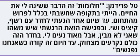 "כל פעם אני מאתגר את עצמי, כאילו, בוא נשכנע אותם מחדש", מסכם פרידמן. "אני רוצה שתשפטו אותי לגמרי באותו רגע. גם אם תגידו שלא טוב לכם, זה בסדר לי. אז כנראה לא פגעתי הפעם. והיו מקרים אחרי 'חלומות', 20 שנה קדימה, שלא פגעתי. אבל התחושה המדהימה, שעשית משהו נכון, שהקהל התאסף, וכולו איתך בסוף ומוכן לצאת איתך למלחמה - זה ניצחון עצום. גם אם זו תוכנית לייט נייט אחת, שעשית ב־1999. זה היה שווה הכול".