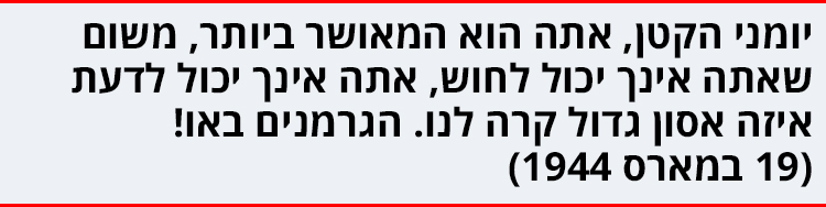 על זאת התחילה אגי ליילל. שמעתי שהיא זחלה באפלה אל המזרן של סבא ואמרה אליו מתוך בכִייה: אבא שלי, סבלנות, הדבר הזה לא יכול להימשך עוד זמן רב! ואף סבתא אמרה עוד: אני באמת אינני רוצה למות, כי אולי עוד אזכה שיבוא עולם יותר טוב ויענישו את כל אלה שהם עכשיו לא אנושיים ורשעים כדי כך.