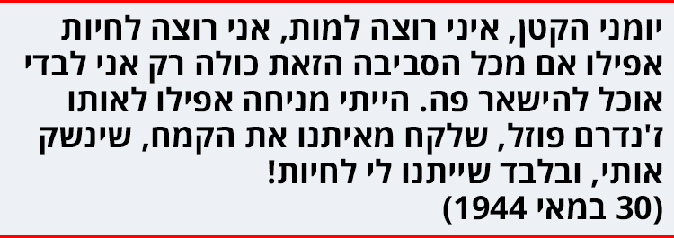 (...) יומני הקטן, אני איני רוצה למות, אני רוצה לחיות אפילו אם מכל הסביבה הזאת כולה רק אני לבדי אוכל להישאר פה. אני הייתי מחכה לסוף המלחמה בתוך איזה מרתף, או על הגג, או באיזה סדק חבוי. אני, יומני הקטן, הייתי מניחה אפילו לאותו ז'נדרם פוזל, שלקח מאיתנו את הקמח, שינשק אותי, ובלבד שלא יהרגוני ובלבד שייתנו לי לחיות!