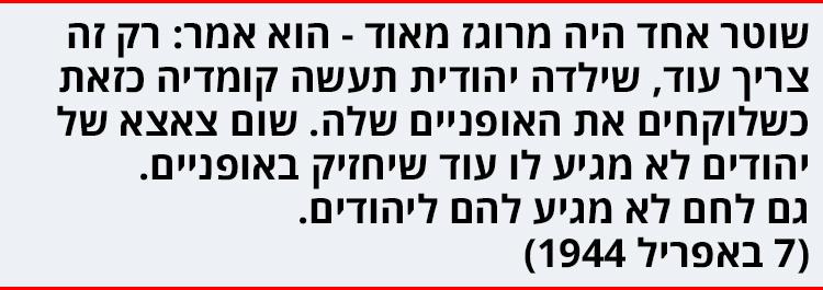 (...) שוטר אחד היה מרוגז מאוד - הוא אמר: רק זה צריך עוד, שילדה יהודית תעשה קומדיה כזאת כשלוקחים את האופניים שלה. שום צאצא של יהודים לא מגיע לו עוד שיחזיק באופניים. גם לחם לא מגיע להם ליהודים, שלא יזללו את הכל אלא יניחו לפיותיהם של החיילים. יכול אתה לתאר לך, יומני הקטן, מה הרגשתי כשאמרו לי זאת לתוך הפנים. דברים שבדומה לזאת שמעתי רק ברדיו או קראתי בעיתון גרמני. בכל זאת דבר אחר הוא כשאתה קורא משהו, או כשמטיחים אותו בפניך. נוסף לכך, כשלוקחים את האופניים שלי. בעצם הדבר, מה הוא סבור, אותו שוטר רשע? שאנחנו גנבנו את האופניים? אנחנו קנינו בכסף מהופמן ועבור הכסף עבד סבא וכל אלה שהוסיפו לכך.