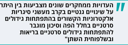 נוסף על הממצאים המצביעים על פליטת חומרים מסרטנים מהסיגריות האלקטרוניות, מה שתורם לחששות של מומחים רבים הוא הממצאים המצביעים על קשר בין חשיפה לחומרים אלה ובין עלייה בסיכון לממאירות. "העדויות ממחקרים שונים מצביעות בין היתר על שינויים גנטיים בקרב מעשני סיגריות אלקטרוניות הקשורים בהתפתחות גידולים סרטניים בחלל הפה וסיכון מוגבר להתפתחות גידולים סרטניים בריאות ובשלפוחית השתן שנצפה במחקרי מעבדה", אומר ד"ר מגיד.