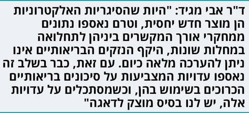 "היות שהסיגריות האלקטרוניות הן מוצר חדש יחסית וטרם נאספו נתונים ממחקרי אורך המקשרים בין העישון שלהן לבין תחלואה במחלות שונות, היקף הנזקים הבריאותיים הכרוכים בעישון סיגריות אלקטרוניות, אקטיבי או כפוי, אינו ניתן להערכה מלאה כיום", אומר ד"ר אבי מגיד, יועץ האגודה למלחמה בסרטן ומרצה לבריאות הציבור במרכז האקדמי פרס. "עם זאת, כבר בשלב זה נאספו עדויות המצביעות על סיכונים בריאותיים שונים הכרוכים בשימוש בהן, וכשמסתכלים על העדויות האלה - יש לנו בסיס מוצק לדאגה".