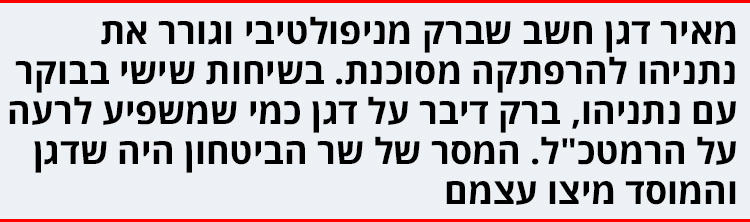 והיתה, כמובן, צלע נוספת למשולש: ראש המוסד, מאיר דגן. שר הביטחון וראש המוסד היו חלוקים זה זמן על המשך הטיפול באיום הגרעיני, אבל עד לאותו לילה, המחלוקות המבצעיות לא גלשו לפסים אישיים. לפתע, אהוד ברק דיבר על כך שדגן הוא אולי לוחם קומנדו טוב, שהוביל את המוסד לכמה מבצעים יפים ברמת השטח, אבל בעידן הסייבר המוסד צריך "ראש" אחר. דגן, לעומת זאת, חשב שברק מניפולטיבי וגורר את נתניהו להרפתקה מסוכנת. בשיחות שישי בבוקר עם נתניהו, ברק דיבר על דגן כמי שמשפיע לרעה על הרמטכ"ל. המסר של שר הביטחון היה שדגן והמוסד מיצו עצמם, שה"ראש" חייב ללכת ושהמוסד חייב להתחדש.
