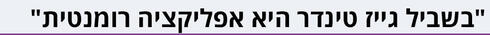 "אני לא רוצה לאכזב אותך, אבל בקהילה הגאה אצל הגברים, הסיפורים העסיסיים יבואו אם תכתבי על גריינדר", אמר לי עודד, בן 36 מתל אביב. לשאלתי אם אין בכלל גייז בטינדר, השיב: "ברור שיש, אבל סיפורי הטינדר שלי מתמקדים בדייטים. גריינדר, לעומת זאת, היא כנראה טינדר של הסטרייטים שמחפשים סקס. ברור אבל שכשבא לי להכיר בחור חמוד ולקבוע דייט מחוץ לבית ובאמת להכיר לעומק, אני מחליף את גריינדר בטינדר. בטינדר לעולם לא אשאל שאלות שהמטרות שלהן הן סקס נטו, אלא שאלות כמו - מה אתה אוהב לעשות? איזו סדרה ראית? במה אתה עובד? דברים שבגריינדר לא מעניינים אף אחד. בשבילנו טינדר היא אפליקציה רומנטית. זה מצחיק אבל באמת נמצאים שם בחורים טובים להביא לאמא. ויש את הסינון הראשוני של המאצ' שזה גאוני".