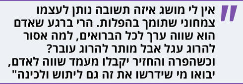 "זו חתיכת שאלה ואין לי מושג איזה תשובה טובה נותן לעצמו צמחוני שתומך בהפלות. יש מיתוג של טבעונות עם שמאלנות ולכן גם עם הרעיון של זכות האישה על גופה, אבל בסופו של דבר זה רק סלוגן. אם החברה והממסד הרפואי היו מקבלים שעובר הוא יצור חי לכל דבר, גם אם לא אדם במלוא מובן המילה, אז לא היו מקבלים את עניין זכות האישה על גופה. במובן המשפטי, המוסרי והפוליטי, זה שמותר לעשות הפלה עד שלב מסוים נובע מהרעיון שעד גיל מסוים העובר הוא לא אדם, אלא גוש בשר. וכיוון שאנחנו כחברה מתירים להרוג עגלים, הגיוני שנתיר לא להמשיך היריון של יצור שאיננו אדם. אבל ברגע שאדם הוא שווה ערך לכל הברואים, אין סיבה שיהיה אסור להרוג עגל אבל יהיה מותר להרוג עובר. אם אסור להרוג אז אסור להרוג".