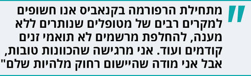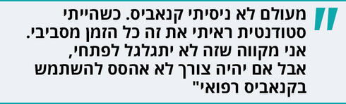 "כשעבדתי בשירות הפסיכולוגי הייתי מייעצת לאבות ואמהות איך נכון להתייחס לילדים, זה היה הרבה לפני שהייתי אמא בעצמי. אין בי סקרנות לנסות את ההשפעות של החומר הזה על הגוף שלי. אני לגמרי חדורת מטרה לשמה התכנסנו וזה לחקור את ההשפעות של הצמח ולראות איך הוא יכול לעזור בריפוי מחלות ובהקלה על תסמינים. מה שכן, ואני מקווה שזה לא יתגלגל לפתחי - אם יהיה צורך רפואי לא אהסס להשתמש בקנאביס רפואי".