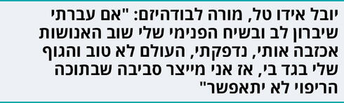 החיבור בין הגוף לנפש הוא חדשות ישנות עבור יובל אידו טל, מורה לבודהיזם והמנהל האדמי של פסיכו־דהרמה, בית הספר לתורת הנפש הבודהיסטית. "במונחים אסיאתיים, אין הפרדה בין כאב פיזי ונפשי. האמת היא שגם ביהדות העתיקה לא עשו הבחנה והייתה הכרה שמדובר בשני היבטים של אותו עניין", הוא אומר. "הכול קשור והכול משפיע גם גופנית וגם נפשית, העניין הוא שבתוך מצבים של סבל יש לנו הנטייה הלא־בריאה להחמיר את המצב. לא כולם, לא כל הזמן, אבל בשפה הבודהיסטית קוראים לזה 'החיצים שהחיים שולחים לנו'. יש את החץ הראשון - מכות החיים הבלתי נמנעות, ויש את החץ השני - התגובות שלנו למכות החיים.