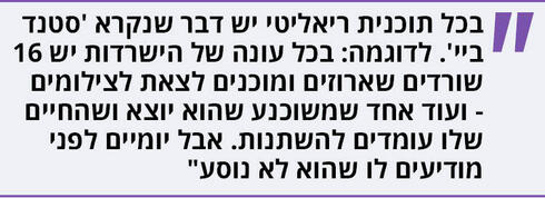 "עכשיו אני צריך לעלות לזכיין ולהציג לו את האנשים. נגיד עכשיו, יודע מאיפה באתי? באתי מהמשרדים של זכיין אחרי ישיבה של יותר משעתיים, שבמהלכן אני מנסה לשכנע אותם לקחת את כל 20 המתמודדים שאני מאמין בהם. לא תמיד אני מצליח. אבל בוא אגלה לך סוד - בכל תוכנית ריאליטי יש דבר שנקרא 'סטנד ביי'. לדוגמה: בכל עונה של הישרדות יש 16 שורדים שארוזים ומוכנים לצאת לצילומים - ועוד אחד שמשוכנע שהוא יוצא ושהחיים שלו עומדים להשתנות. אבל יומיים לפני מודיעים לו שהוא לא נוסע".