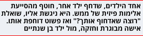 בהפסקת החצר, אני רואה את הסייעת מושכת בכוח בידו של אחד הילדים ומושיבה אותו באלימות על אחת הספות. "תשב כאן. אתה לא יוצא!" היא חוזרת אל החצר וטורקת את הדלת. לאחר דקות ארוכות של בכי, כשאף אחת לא ניגשת אליו, עוזבת אחת הסייעות את התינוקייה ומנסה להרגיע אותו.