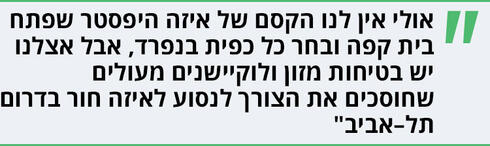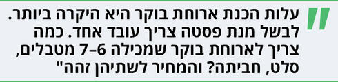 קורן: "נכון. עלות הכנת ארוחת בוקר היא היקרה ביותר. לדוגמה, לבשל מנת פסטה צריך עובד אחד. חשבת כמה עובדים צריך לארוחת בוקר שמכילה 7־6 מטבלים, סלט קצוץ, חביתה טרייה היישר מהמחבת? אני צריך עובד שיקצוץ את הסלט, אחד שיכין את החביתה על המקום, למלא את הצלוחיות, המון ספקים - לירקות, לגבינות, לממרח האבוקדו וכו'. כמות הלחם שהישראלים אוכלים בארוחת בוקר גדולה במיוחד. יש אין סוף כלים לשטיפה, בניגוד לצלחת פסטה אחת. והמחיר של מנת פסטה וארוחת בוקר זהה! ועדיין, לארוחת הבוקר יש המון כוח בציבור הישראלי, זה שם נפרד לפינוק, נדיבות, ואין סיכוי שהיא תרד מהתפריט. אנחנו רק מחפשים לשדרג, אם כי ניסיונות להגיש פורמט אחר לא צלחו. הציבור הישראלי לא מוותר על חביתה-סלט וכו'".