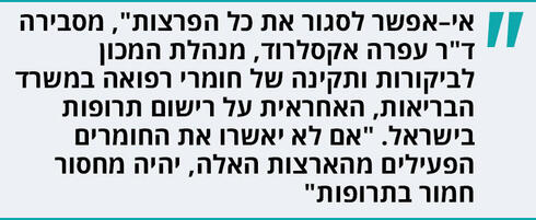 "כשמדובר בחומרים שמגיעים מחו"ל אנחנו נסמכים על ביקורות של רשויות עולמיות שאנחנו מכירים בהן, כמו ה־FDA ורשות התרופות האירופית. וההיבט השלישי שנבחן לצורך הבטחת איכות החומרים, הן מייצור מקומי והן מיבוא, הוא הדוגמאות שנדגמות לבדיקת מעבדה במשרד הבריאות, כדי לבדוק שהחומר עומד בסטנדרטים ובמה שהיצרן הבטיח. אנחנו בעצמנו לא יוצאים לביקורות של אתרי ייצור חומרי גלם פעיל בחו"ל".
