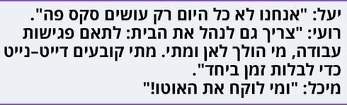 "אנחנו לא כל היום רק מזדיינים פה", מבהירה יעל בשיחת טלפון מאוחרת יותר. במסגרת ההתנהלות המשפחתית, היא עצמה אחראית על טבלאות האקסל של הבית. "אני גם מנהלת את הישיבות הלוגיסטיות, רשימות משימות של מי צריך לעשות מה ומתי. נגיד בישיבה האחרונה עלה שצריך לסיים לבנות את הדק מסביב לבריכה. אה, ויש לנו גם שלוש מכוניות".