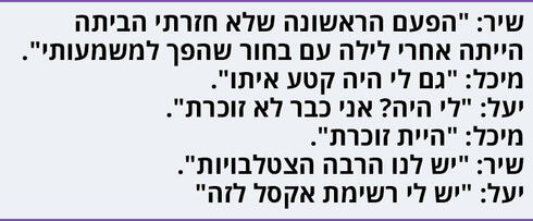 שיר: "זאת הייתה הפעם הראשונה שלא חזרתי הביתה אחרי שאביב ואני פתחנו את היחסים. אז עוד היה לנו חוק שתמיד חוזרים לישון ביחד, אבל הלילה היה כל כך סוחף שחזרתי רק בעשר בבוקר. אביב נפגע, דיברנו על זה הרבה".