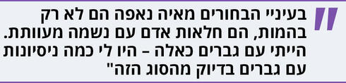 בתקופת הצבא שלי, בבית הספר למ"כים בירוחם, היו לי כמה חוויות מיניות טראומטיות עם גברים. אקטים שנעשו בכפייה. במובן הזה, אני מרגישה שכמעט כל אישה חוותה אונס. לא במובן של מישהו שתקף אותה, אלא מתוך סיטואציה שבה אישה מבקשת לעצור, והגבר שאיתה פשוט לא רואה אותה. ואת, ממקום מרצה, שוכבת עם גבר, אף שאת לא רוצה.