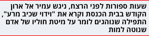 בצהריים שוב הגיעו לבית הכנסת, לתפילת מנחה. אחריה, חמק יגאל מאחיו בפעם הראשונה באותו יום. האב והאח חשבו שהוא כבר התקדם אל עבר הבית, אבל יגאל נותר לבדו בבית הכנסת. הוא ניגש אל ארון הקודש כשבידו סידור וקרא את "וידוי שכיב מרע", התפילה שאותה קוראים על מיטת חוליו של אדם שנוטה למות. בנוסח התפילה מבקש המתפלל שמותו לא יהא לשווא, והיא מסתיימת במילים: "ותן חלקי בגן עדן וזכני בעולם הבא המצופה לצדיקים".