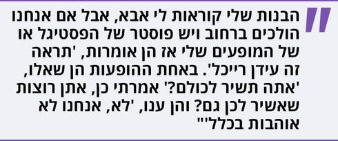 "חשבתי שזה מקסים. יכול להיות שהן קלטו את זה ברדאר במהלך השנים אבל כן זיהו את זה עם הפסטיגל. הבנות שלי עושות הפרדה פסיכולוגית שעדיין לא ברור לי מאיפה היא באה. הן קוראות לי אבא, אבל אם אנחנו הולכים ברחוב ויש פוסטר של הפסטיגל או של המופעים שלי אז הן אומרות, 'תראה זה עידן רייכל'. באחת ההופעות בצהריים הן רצו על הכיסאות בפסטיגל ושאלו, 'אבא פה זו ההופעה?' עניתי שכן. 'ואתה תשיר לכולם?' אמרתי, כן, אתן רוצות שאשיר לכן גם? והן עונות, 'לא, אנחנו לא אוהבות בכלל'. או שדמאריס אמרה להן בצהריים, לכו לישון, בערב לאבא יש הופעה. והן ענו, 'אנחנו ממש לא צריכות לישון בצהריים. בהופעות של אבא אנחנו ישנות ממש טוב'".