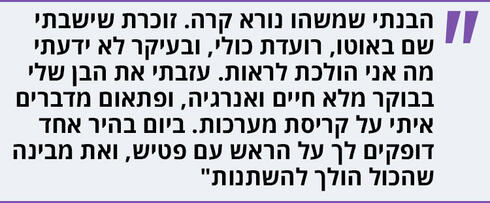 "נכון, אבל מהר מאוד אתה מבין שצריך לטפל בדברים. אתה ישר נכנס ללו"ז טיפולים שצריך לנהל. מטבעי, אני די פרויקטורית. יודעת לעבור משלב לשלב, לסמן וי, עד נקודת הסיום. בשלב די מוקדם הילד שלנו נדרש לקבל טיפולים לא פשוטים. בן אדם במצב נפשי ירוד, מעורער ומבולבל, לא יכול לתפקד בסיטואציה כזאת אם הוא לא תופס את עצמו בידיים. היה בי איזה מנגנון הישרדותי שאיפשר לי להמשיך הלאה. אדם בהישרדות מסוגל להרבה יותר ממה שנדמה לו. זה משהו שגיליתי על עצמי ואני לא חושבת שהייתי יודעת את זה לולא מה שקרה. גיליתי בתוכי עוצמות שאחרת לא הייתי יודעת שיש בי אותן".