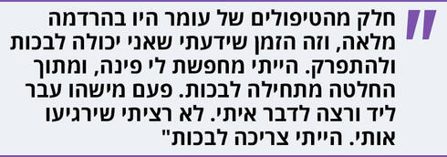 "ברור. היה לי מאוד חשוב להיות חיובית, אבל גם לפרוק מדי פעם. חלק מהטיפולים של עומר היו בהרדמה מלאה, ובכל פעם שהיה טיפול כזה, זה הזמן שידעתי שאני יכולה לבכות ולהתפרק. הייתי איתו בחדר, היו מרדימים אותו לפני הטיפול, והייתי יוצאת, מחפשת לי פינה ומתוך החלטה - מתחילה לבכות. פעם מישהו עבר במסדרון ליד - ישבתי על הרצפה כי לא מצאתי מקום לשבת, ובכיתי - ורצה לדבר איתי. רציתי להיות מנומסת אליו, להיענות לניסיון שלו להרגיע אותי, אבל מצד שני הייתי ממש זקוקה לזמן הזה. לא רציתי שירגיעו אותי. הייתי צריכה את השחרור הזה, לבכות".
