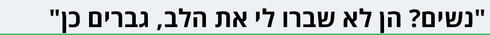 "באמת שיברון לב? רק מגברים. לא נשים הן אלו ששוברות לך את הלב, גברים עושים את זה, חברים ושותפים מקצועיים. ואולי זה כי לא נתתי את הלב שלי בשלמותו אף פעם לנשים, נתתי רק פעם אחת. ובעצם עדיין יש לה אותו".