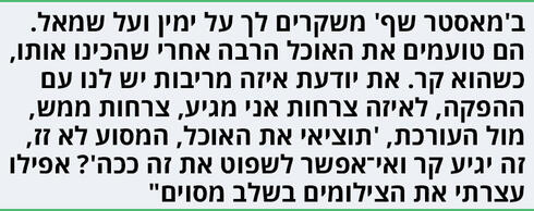 "הם באמת משקרים לך על ימין ועל שמאל. תראי, אני לא יודע אם הם משקרים גם בטעים או לא טעים, אבל הם טועמים את האוכל הרבה אחרי שהכינו אותו, כשהוא קר. את יודעת איזה מריבות יש לנו עם ההפקה, לאיזה צרחות אני מגיע, צרחות ממש, מול העורכת, 'תוציאי את האוכל, המסוע לא זז, זה יגיע קר ואי־אפשר לשפוט את זה ככה'? אפילו עצרתי את הצילומים בשלב מסוים. יש לנו פה את מושיק, שף עם שני כוכבי מישלן, שף מדהים, יש לנו את ארז, שף שהמציא את הקולינריה הישראלית, יש פה אותי שזה בן־אדם עם מסעדות בכל העולם, אתם לא יכולים להוריד אותנו לרצפה מקצועית. אצלנו זה יותר מקצועי וזאת גם אחת הסיבות שאני נהנה לעשות את הפורמט".