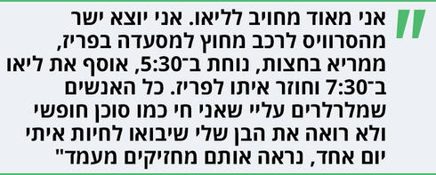 "בפריז אני ישן במלון, אני קם בבוקר, יורד במעלית, התלבושת של השף והסינר הכחול כבר עליי, עושה לי את האספרסו, מזמין אובר וזהו, אני ב'שבור'. אני יכול ללכת לספא, או לבריכה, או לטייל בפריז, אבל אני מעדיף ללכת למטבח. מגיע הערב, והמסעדה נפתחת ואני נכנס לבשל, נותן סרוויס שלם. בלילה מאוחר אני חוזר למלון וזהו. למחרת הכל מתחיל עוד פעם. וכל זה, השגרה הזאת, זה החלום שלי. ככה אני רוצה לחיות כל הזמן. לקלף ברבוניות, זה מה שאני הכי אוהב".
