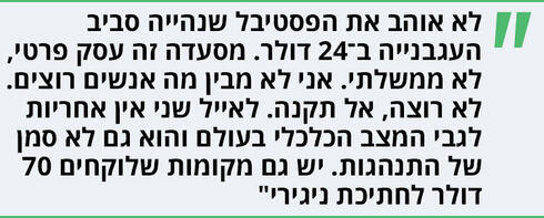 "לא אוהב את הפסטיבל שנהיה סביב העגבנייה ב־24 דולר. מסעדה זה עסק פרטי, לא ממשלתי. אני לא מבין מה אנשים רוצים. לאייל שני אין אחריות לגבי המצב הכלכלי בעולם והוא גם לא סמן של התנהגות. יש גם מקומות שלוקחים 70 דולר לחתיכת ניגירי. ואל תטעי, גם אייל מאוד מצליח בחו"ל, זו פשוט פילוסופיה אחרת של מסעדנות".