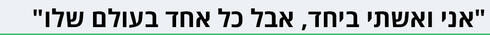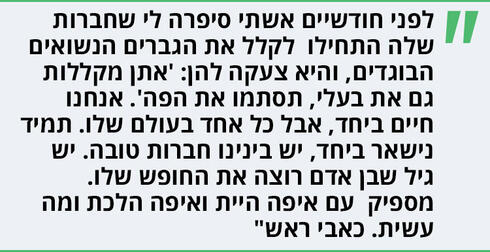 "אתה אמרת. את אשתי זה לא מעניין עכשיו. לפני חודשיים היא סיפרה לי שחברות שלה התחילו לקלל את הגברים הנשואים הבוגדים, והיא צעקה להן: אתן מקללות גם את בעלי, תסתמו את הפה. היא לא רצתה לשמוע שמקללים אותי. אנחנו חיים ביחד, אבל כל אחד בעולם שלו. תמיד נישאר ביחד, יש בינינו חברות טובה. אם אחד מאיתנו לא מרגיש טוב או משהו, הופכים את העולם. ככה צריך לחיות. יש גיל שבן אדם רוצה את החופש שלו. מספיק עם איפה היית ואיפה הלכת ומה עשית. כאבי ראש. אני לא יכול לשמוע את השאלות האלה, וגם לא אוהב לשאול".