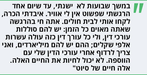 "במשך שבועות לא ישנתי, עד שיום אחד הרגשתי שפשוט אין לי אוויר. איבדתי הכרה, לקחו אותי לבית חולים. אתה חי בהרגשה שאתה מאוים כל הזמן. יש להם סוללות עורכי דין, ולי כל עורך דין כזה עולה עשרות אלפי שקלים. ההם יש להם מיליארדים, ואני צריך לרדוף אחרי עורכי הדין שלי עם הווספה. לא יכול לחיות את החיים האלה. אלה חיים של סיוט".