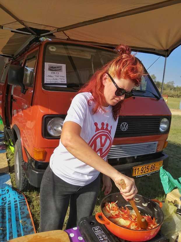 "צידניות עם אוכל וגזיות. בחלק מהרכבים יש גנרטורים, ואם אין אז משתמשים בפנסים. אפשר בהחלט לבשל גורמה גם בתנאי שטח. אני מצליחה לבשל דברים שמשאירים את החברים בהלם. אני מגיעה עם כל התבלינים המיוחדים שלי מהבית. בכל טרנספורטר תמצאו גם ארגז של מוצרי מזון יבשים וקופסאות שימורים, למקרה שתנאי השטח לא יאפשרו לבשל. אגב, אנחנו מקפידים לא להשתמש בכלל בכלים חד-פעמיים כדי לא לפגוע בטבע, זה כלל חשוב בחבורה שלנו.