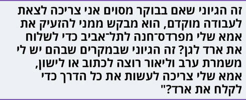 "זה הגיוני שאם בבוקר מסוים אני צריכה לצאת לעבודה מוקדם, הוא מבקש ממני להזעיק את אמא שלי מפרדס־חנה לתל־אביב כדי לשלוח את ארד לגן? זה הגיוני שבמקרים שבהם יש לי משמרת ערב וליאור רוצה לכתוב או לישון, אמא שלי צריכה לעשות את כל הדרך כדי לקלח את ארד? שתינו התרגלנו למצב. ככל שהתרגלתי למצב הזה הפסקתי לדבר על זה עם הוריי ובהמשך גם לא שיתפתי את חברותיי הטובות. לא רציתי לקטר והבנתי שמהקיטורים לא תצמח שום תועלת. זה ליאור".