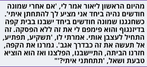 "ליאור אמר לי כבר בתחילת הקשר, 'תדעי לך שהמחשב הוא אשתי הראשונה. כשאני כותב אסור להפריע לי. זה קדוש'. כשאת שומעת מוטו כזה כל כך הרבה פעמים הוא מחלחל לתוכך וגם את מתחילה להאמין בו. רציתי שננהל חיי משפחה וחיי זוגיות עד שהתפכחתי מהעיוורון וקלטתי שזה לא יקרה לעולם, לא איתו".
