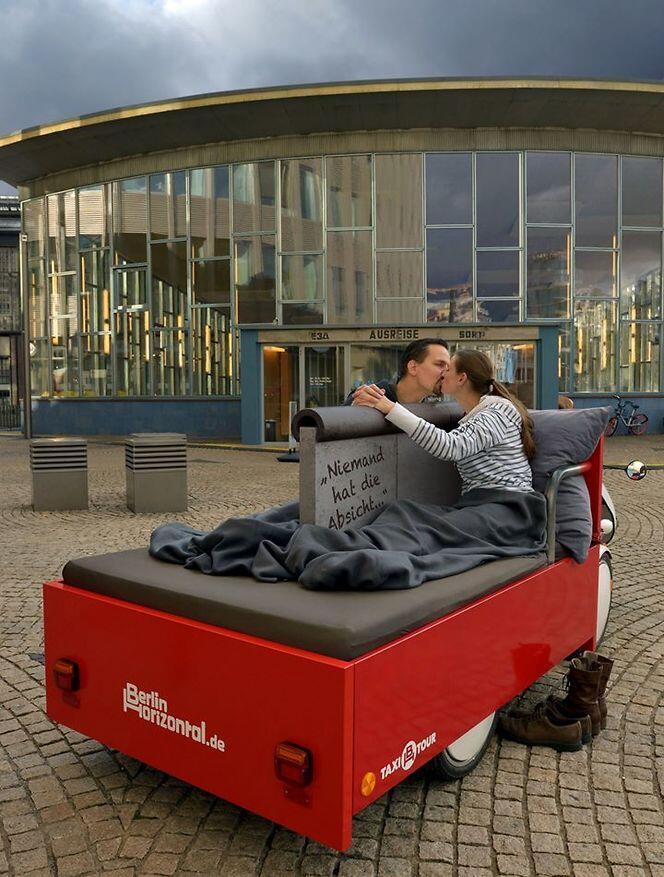 איך להגיע לתחנה הראשונה? מונית, קורקינט, רכבת תחתית? כל האפשרויות נחמדות ושמרניות, אבל אתם כבר בברלין, למה לא להיכנס למערכת הדם של העיר ולנסות לעשות דברים שהם קצת מחתרתיים? נגיד, להסתובב בברלין על מיטה שמחוברת לריקשה ולראות אותה במצב אופקי? השירות כולל שמיכות חמות (השירות ניתן עד אפס מעלות), אפשר לעשן ואפילו לשתות.