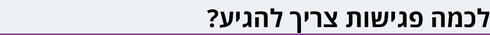 לכל יועץ ובכל תחנה יש המלצות לגבי מספר מפגשים מינימלי שנדרש על מנת לחוש בשינוי, וכמובן שתמיד ניתן להחליט שרוצים להפסיק את התהליך. כך או כך, ההמלצה שלי היא ראשית להגיע למפגש הראשון. לאחר מכן לכוון עצמכם לעוד חמישה מפגשים, ואם אתם מרגישים שהקשר עובר שינוי ושאתם מגיעים לתובנות חדשות, אז להמשיך לעוד חמישה עד עשרה מפגשים נוספים. ישנם זוגות שממשיכים להיפגש עם היועץ גם חודשים לאחר מכן, לעיתים בתדירות נמוכה יותר, זאת כמובן בהתאם לרצון, צורך, הנאה מהתהליך וכדומה.