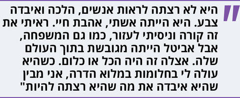 "לא ראינו את זה בא בכלל. היא כן אמרה שרע לה ולא הסתירה את זה. היה גם משפט שחזר - 'מה אני אעשה עם עצמי בחיים', אחרי שסיימה את עבודתה כאשת מכירות בחברת היי־טק. אבל נחשפתי לעמותות שמנסות לעזור ולהציל אנשים בדיכאון ויש עמותה בגישה שאומרת שזה גל. כלומר, שאם בן־אדם מצליח לעבור את הגל הקשה הזה של הדיכאון, הוא יכול לשרוד. הנטייה הראשונה שלי בשבעה הייתה לומר, 'למה אתם מכניסים אותי למועדון שלכם, של אלה שאיבדו קרובים'. אבל עכשיו המחשבה היא להאיר את הנקודה הזאת כדי שהבן־אדם שבכלל מעלה צעד כזה בראש, יבין איזה תהום הוא משאיר אחריו".