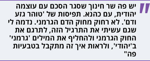 "הרבה סביב יחסי יהודים־ערבים. משפטים כמו, 'זאת לא המדינה שלהם', 'שיגידו תודה שהם פה'. מהדהדים מה ששומעים מנבחרי ציבור. מבחינתי אפשר להגיד הכול, עד לקו האדום של גזענות. זה לא קורה הרבה, אבל כשזה קורה, אני מתקיף כמו אמסטף. אבל אתה יודע, יש פה שר חינוך שסגר הסכם עם עוצמה יהודית. עם כהנא! תפיסות של 'טוהר גזע ודם'. לא רחוק מחוק הדם הגרמני. נדמה לי שגם עשיתי את התרגיל הזה, לתרגם את החוק הגרמני ולהחליף את המילים 'גרמני' ב'יהודי', ולראות איך זה מתקבל בטבעיות פה".