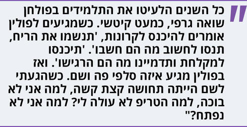 "בכל זאת נותר דבר אחד שמאוד הפריע לי. כל השנים הלעיטו אותם בפולחן שואה גרפי, כמעט קיטשי. להיכנס לקרונות, 'תנשמו את הריח, תנסו לחשוב מה הם חשבו'. 'תיכנסו למקלחת ותדמיינו מה הם הרגישו'. התלמידים מולעטים בזה מגיל הגן. ואז גם מגיע איזה סלפי פה ושם. הגדרתי כמה חוקים ברורים. אצלנו לא מצלמים סלפי. צלמו מה שעיניכם רואות, לא את עצמכם. כמו פעם, כשהיה לנו סרט צילום של 36 תמונות. אולי המזכרת שתשמרו היא לא אתם?"
