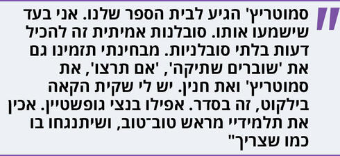 "מצד שני, סמוטריץ' הגיע לבית הספר שלנו. אני בעד שישמעו אותו. סובלנות אמיתית זה להכיל דעות בלתי סובלניות. יותר מזה: אם אבוא עם תלמידיי לכיתה דתית ונתבקש לשבת בהפרדה, אכבד את הבקשה, כי זו הכנסת האורחים. אבל! אם אתם באים אלינו, תתכבדו ותעשו כמו אצלנו. ואם זה לא יקרה? לעמוד על הרגליים האחוריות ולהתנגד. זה לא יעבור. מבחינתי תזמינו גם את 'שוברים שתיקה', 'אם תרצו', את סמוטריץ' ואת חנין. יש לי שקית הקאה בילקוט, זה בסדר. אפילו בנצי גופשטיין. אכין את תלמידיי מראש טוב־טוב, ושיתנגחו בו כמו שצריך. העיקר הוא שהבסיס יהיה, דיון וויכוח".