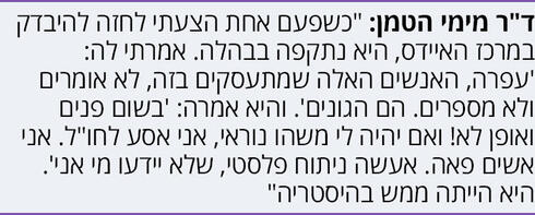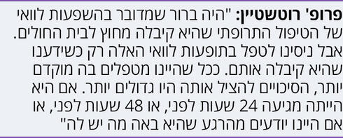 פרופ' רוטשטיין: "היה ברור שמדובר בהשפעות לוואי של הטיפול התרופתי שהיא קיבלה מחוץ לבית החולים. אבל ניסינו לטפל בתופעות הלוואי האלה רק כשידענו שהיא קיבלה אותם. ועד שהבנו מי הן, מה הן ומה התרופות האלה ידעו לעשות - רצנו לחפש מקרים דומים בעולם. זה היה נדיר".