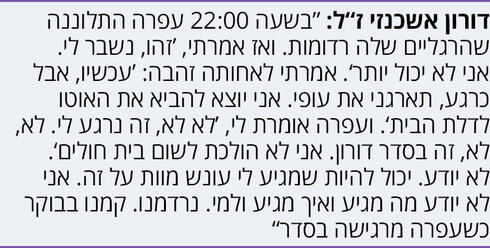 היא לא דיברה על כך עם דורון. "מי היה יכול לדבר איתו? את יודעת באיזה מצב הוא היה? עם זקן ובשחור, ומכונס בתוך עצמו. הפך מפרח מלבלב לקמל. כבר אי־אפשר להתקרב אליו, ואי־אפשר היה לעזור לו בכלום. זה חוסר אונים נוראי".