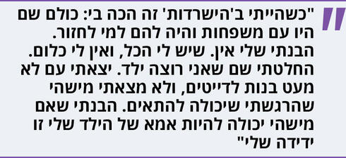 "כן, אנשים טענו שהם מחפשים הורות, אבל חיפשו זוגיות. אני הסתכלתי על כל אחד מהם נטו כאבא לילדים - אם הוא אינטליגנטי, עובד - בלי הפרמטרים של בן זוג, בלי לשאול אם אני נמשכת אליו או לא. בסוף נפלתי על אדם שחשב כמוני. יצאתי עם שלושה־ארבעה גברים עד שמצאתי אותו".