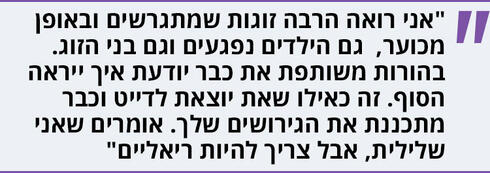 "קבענו למשל, שבמקרה מוות של שנינו אחותי מקבלת את הילדה, ואם רק אחד מת, אז השני. קבענו גם מה יהיה המרחק הגיאוגרפי שלנו זה מזה. סיכמנו על חינוך חילוני - לכבוד, לקבלת האחר, על מזונות כמובן, על חלוקת משמרות. ההחלטה הייתה שהיא תהיה 70 אחוז מהזמן אצלי, במיוחד בגילים הקטנים. הוא גר רבע שעה ממני, והגן של הבת שלנו פה".