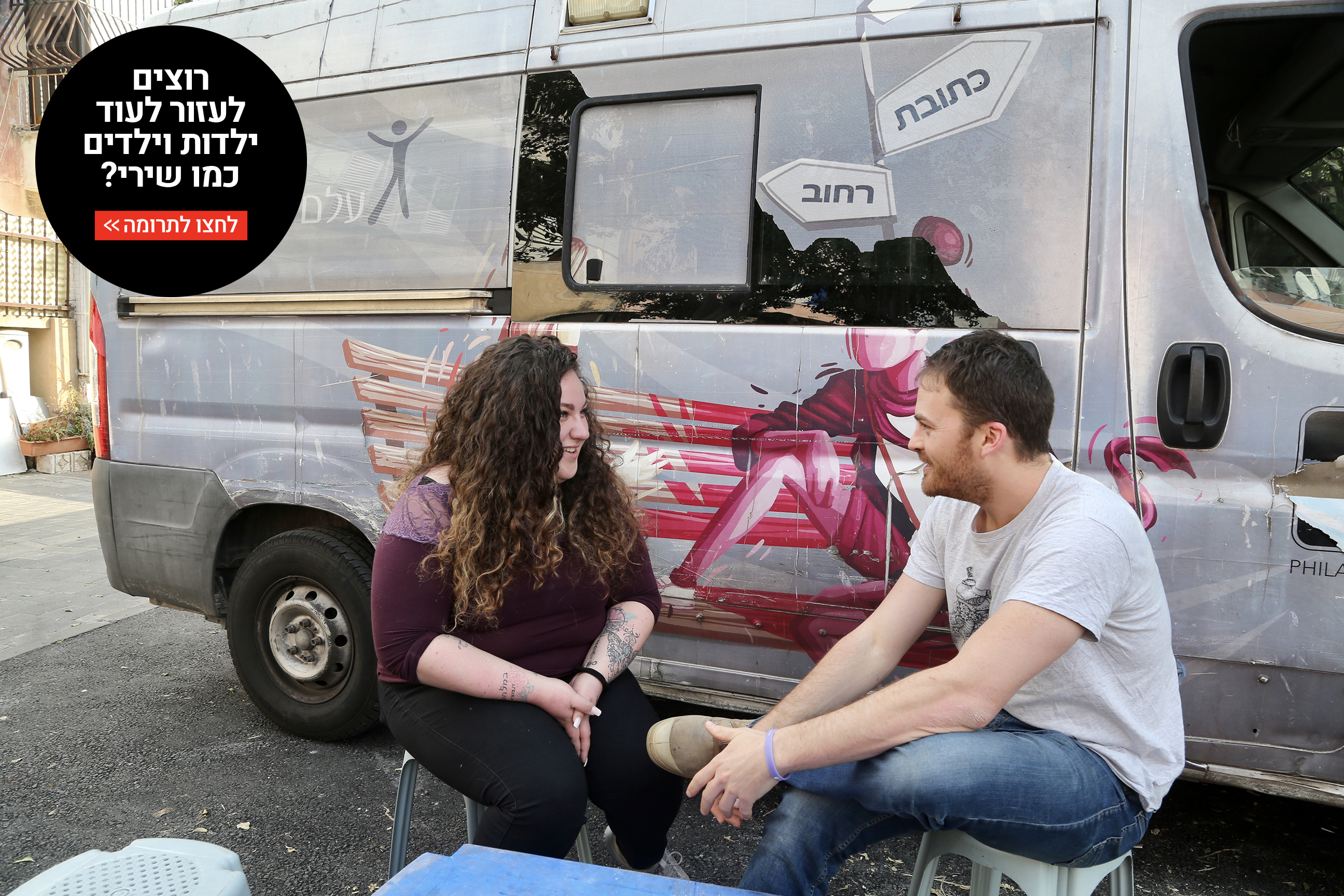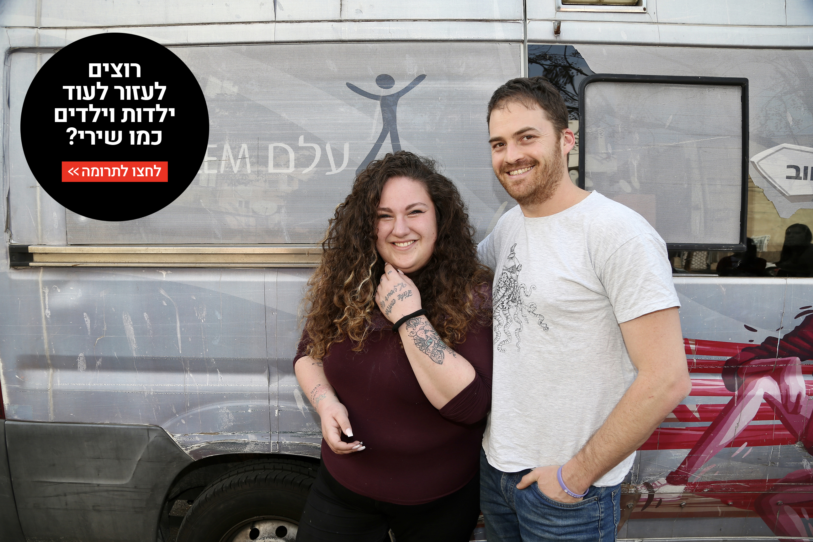 שירי שרון זייד ועומר שקד על רקע הניידת של "עלם" (צילום :יריב כץ)
